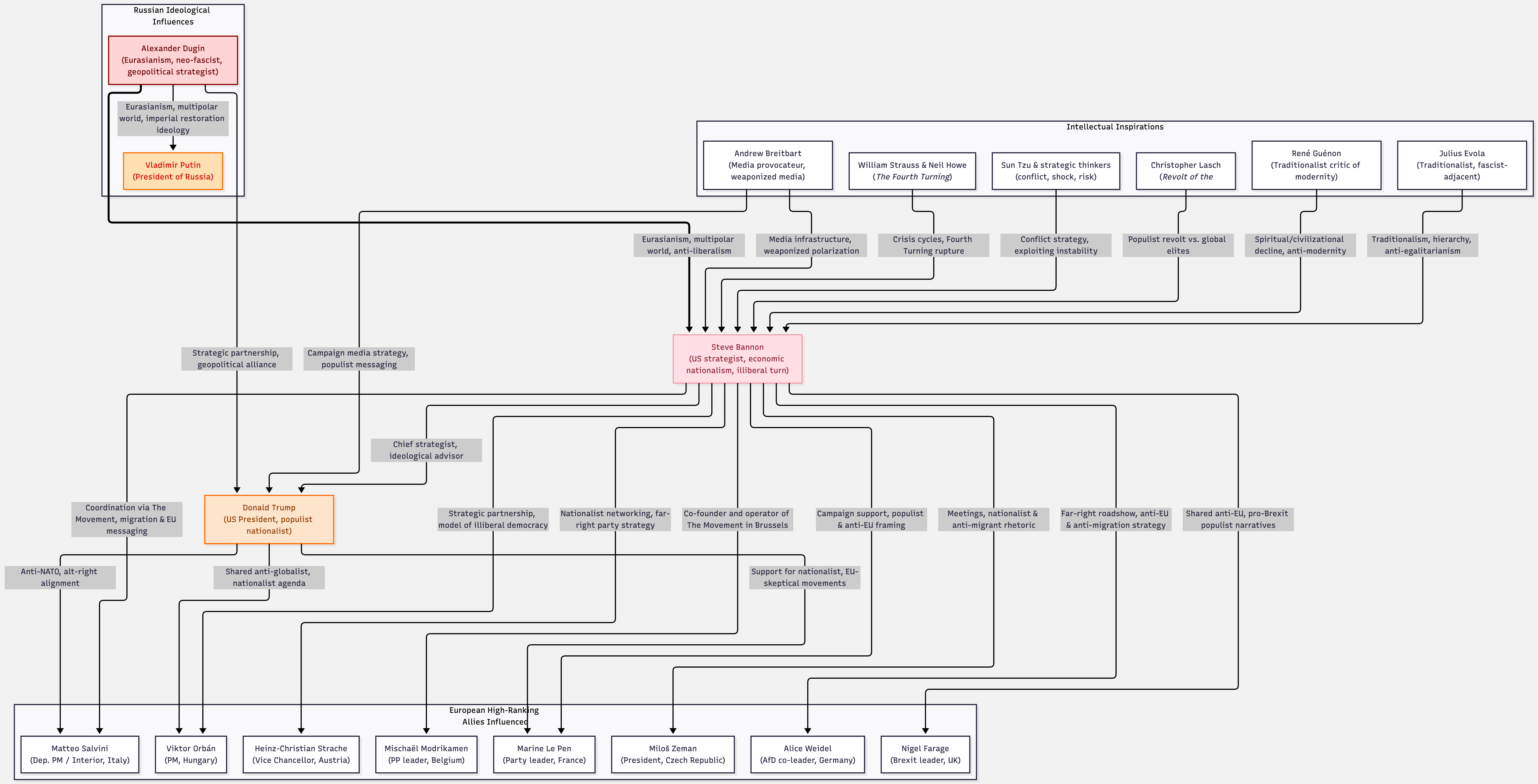 Bannonâs project explicitly aims to fracture the EU and reconfigure Western politics around nationalist strongmen and permanent cultural conflict, undermining the norms that sustain pluralist democracy. By offering media infrastructure, messaging templates and strategic coordination to leaders like OrbĂĄn, Salvini and Le Pen, he acts as one of the masterminds behind a transnational effort to hollow out liberal institutions from within and normalize autocratic styles of governance under a democratic veneer.niskanencenter+2â